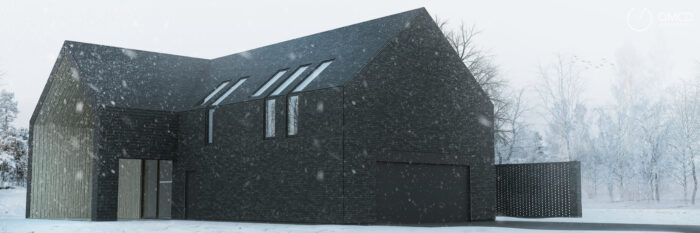 Design of a single-family house near Lublin. The facades and fence are made of black brick.